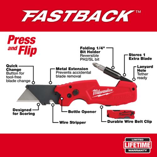 'The Milwaukee® Fastback™ 6-In-1 Folding Utility Knife Features A Press And Flip Mechanism Providing Users With An Easy, One-Handed Opening. The 6-In-1 Knife Has A Wire Stripper, Folding Screwdriver, And A Fold-Out 1/4" Bit Holder. The Bit Holder Includes A Reversible Phillips #2 And Slotted 1/4" Bit. This Folding Utility Knife Is Equipped With A Built-In Bottle Opener Providing Users With Added Functionality. Tool Free Blade Change Allows The User To Quickly And Easily Insert A New Blade. This Multifunction Pocket Knife Has An All Metal Design For A Longer Life With A Durable Wire Belt Clip To Reduce Pocket Tearing With A Blade Holder Designed For Scoring. The Folding Utility Knife Has A Metal Extension That Prevents Accidental Blade Removal And A Lanyard Hole For Convenient Tethering.
