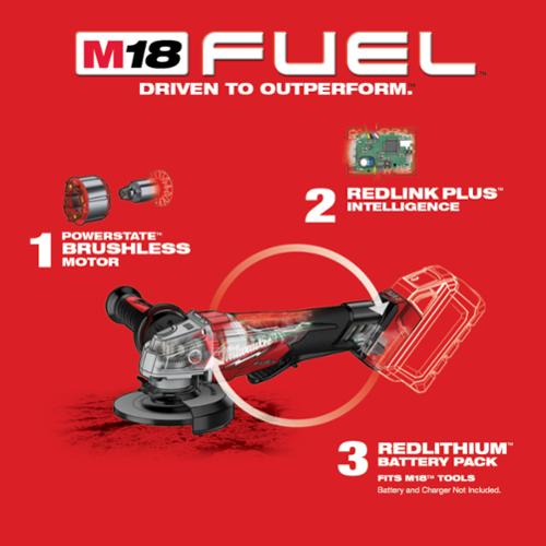'The Milwaukee® M18 FUEL™ 4-1/2" To 5" Grinder Paddle Switch, No Lock Is The Next Advancement In Power And Performance, Generating 11A Corded Power, Fastest Cutting, And Delivering Up To 135 Cuts Per Charge. The Powerstate™ Brushless Motor Delivers Maximum Sustained Power And 8,500 RPM To Remove Material Faster And Increase Productivity. Redlink Plus™ Intelligence Ensures Unmatched Levels Of Performance, Protection, And Compatibility. The M18 FUEL™ 4-1/2" To 5" Grinder Includes An Electronic Clutch For Kickback Protection, As Well As Overload Protection To Maximize Motor Life. With Tool-Free Accessory And Guard Adjustments, Users Will Experience Faster Accessory Changes, And Less Downtime, While Remaining Fully Compatible With The Most Common Accessories In The Market. The M18 FUEL™ 4-1/2" To 5" Grinder Takes Cordless Grinders To The Next Level In Performance And Run-Time.