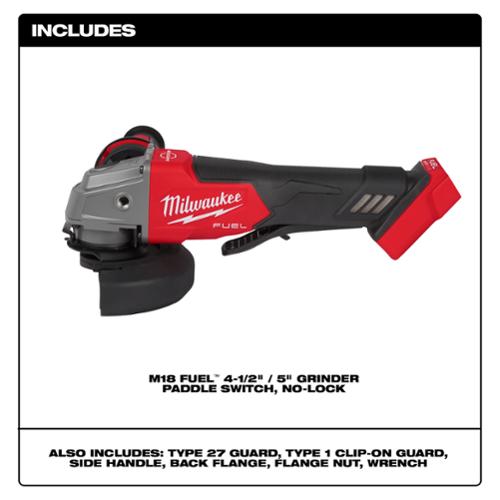 • Includes: (1) M18 FUEL™ 4-1/2" To 5" Grinder Paddle Switch, No-Lock, (1) T27 Guard, (1) T1 Clip-On Guard, (1) Side Handle, (1) Spanner Wrench, (1) Back Flange, (1) Flange Nut