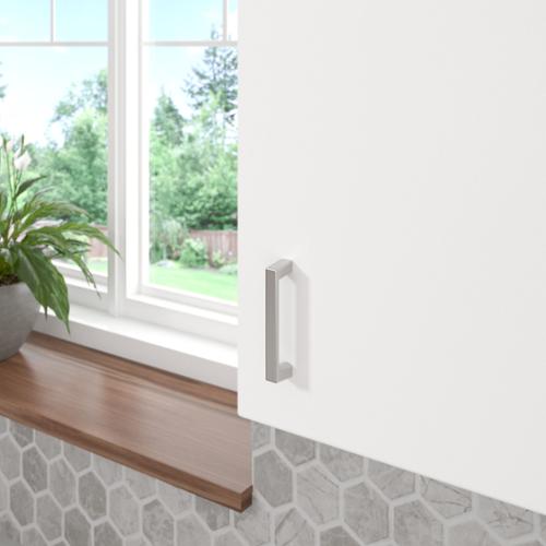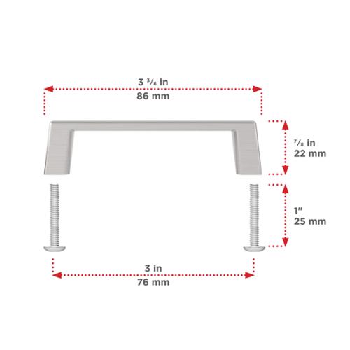 Bring contemporary flair to your closets, cabinets, or drawers with the Eglinton pull collection from Richelieu. Sturdy, sleek, and timeless, they are uniquely designed to have a lower clearance than similar handles, which makes them especially suitable for small spaces. The pulls are discreet and smooth to the touch, with a modern and interesting shape that features a more minimalist bar and thicker handle legs. Durable and easy to clean, the chic metal pulls are manufactured to the highest industry standards. The screws included with the products are a standard size of 1 in (25 mm) length, quadrex, pan head. They will fit with most of the popular melamine thicknesses, which range between 5/8 in to 3/4 in (16 mm to 19 mm).