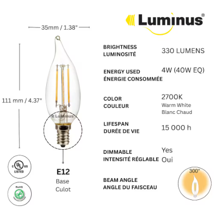 ▪ 2700 Kelvin▪ Candelabra Base▪ 15000 Average Hour Life▪ 330 Lumens
