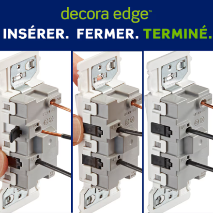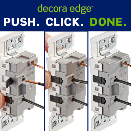 Decora Edge wiring devices provide the traditional appearance and superior performance of Decora devices in a faster, easier-to-install, and safer design. The line consists of Single Pole and 3-Way Switches and a Tamper-Resistant Outlet. Innovative installation features such as color-coded lever terminals (including the ground terminal) for faster, efficient wiring, a larger strap with a unique tongue and groove alignment feature for quicker trim out on multi-gang installations, and no exposed metal parts for safety, make Decora Edge ideal for new home construction and MDU projects as well as retrofit applications. Installers using Decora Edge will experience an installation process as unique as it is practical. The color-coded levers provide the foundation for quick installation by helping to rapidly identify the correct terminal for wiring, including a lever terminal for the ground wire. The lever termination feature assures a positive connection has been made.