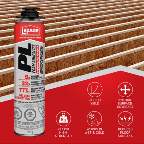 LePage® PL Subfloor Foam Construction Adhesive Is A High-Strength, Polyurethane Foam That Expands To Fill Gaps And Reduce Floor Squeaks. Ideal For Bonding Subfloors To Joists — Even On Wet, Frozen, Or Dry Surfaces — It Delivers Fast Application And A Superior Hold.