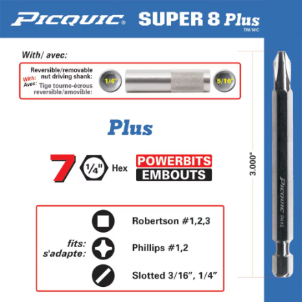 • The bit assortment in the Super 8 Plus has been carefully selected to make it the ideal tool for the majority of Canadian Properties. Comes standard with seven 3" long hex power bits (R1, R2, R3, P1, P2, S3/16", S1/4") plus a double ended nut driver, 1/4" and 5/16"