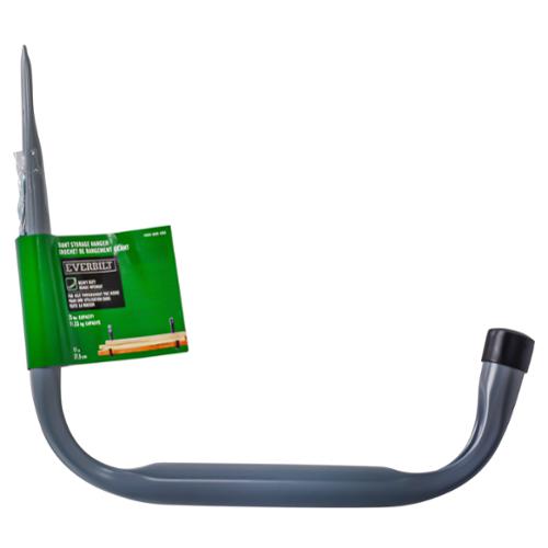 'Everbilt's Giant Storage Hanger is an ideal fixed storage hook for oversized items that need hanging in a garage, shed, or shop. Grey powder coating provides moderate rust resistance. Mounting to a wall stud is recommended for secure application. Requires 1/8-in pilot hole. Fasteners included. Working load capacity is 25 lb.