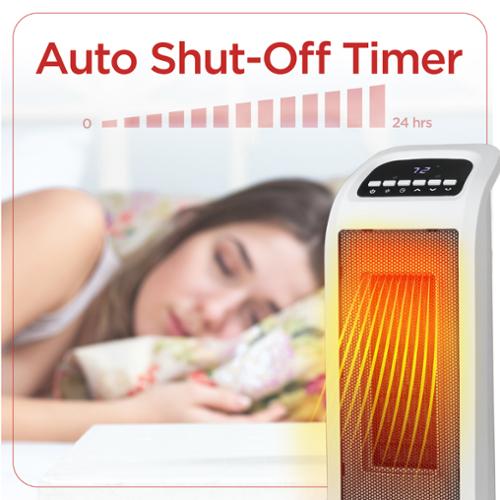 • Impressive Functions Incorporated With This Oscillating Heater Tower Include A Power-On Indicator Light, Safety Overheats Protection And Auto Shutoff, A Power Cord Length Of 6 Feet, A 24-Hour Programmable Timer, Adjustable Thermostat Controls, And Ultra-Convenient Remote Control.